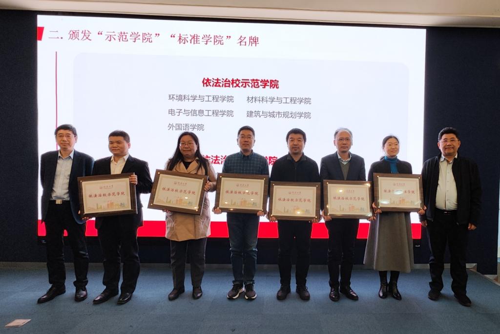 4月3日下午,学校依法治校示范学院创建工作交流会在四平路校区举行。学校党委副书记吴广明宣读第二批获评“依法治校示范学院”“依法治校标准学院”的单位名单,我院入选“依法治校示范学院”。常务副校长吕培明、党委副书记吴广明为获评学院颁发名牌。