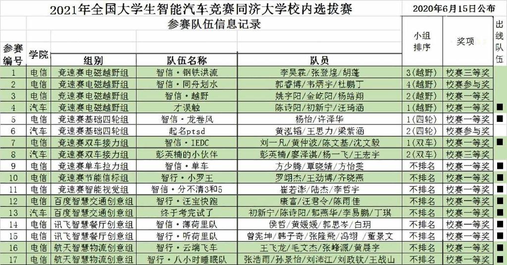 比赛当日,同济大学校内(竞速赛)选拔赛按组别分别在电信学院基地赛道和汽车学院基地赛道举行。按照校内选拔赛规则,参赛队伍的名次(成绩)由成功完成现场赛道比赛任务的时间来决定。每个组别的参赛队伍按总体最优成绩排序,获得第一名的队伍将代表同济大学参加今年7月举行的第十六届全国大学生智能汽车竞赛华东分赛区比赛(2021竞速赛每个组别最多允许1支队伍)。另外,因本年度创意赛报名规则改变,创意赛3个组别的队伍已于5月参加全国线上选拔初赛决出下一阶段参赛队伍(2021创意赛每个组别最多允许2支队伍)。根据比赛成绩,13支队伍获校赛一等奖,2支队伍获校赛三等奖,2支队伍获校赛参与奖。获得校内赛奖项的队伍,可申请校本科生院认可的创新学分。