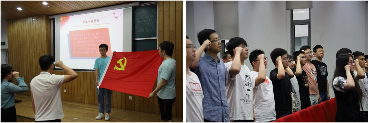 在领誓人博士生第十二支部书记郑永飞的带领下,与会党员重温入党誓词,面向党旗庄严宣誓:“我志愿加入中国共产党,拥护党的纲领,遵守党的章程,履行党员义务,执行党的决定……”,铿锵的誓言传达出身为共产党员的自豪感和使命感,展示了我院师生党员为党和人民的事业奋斗终身的理想和追求。