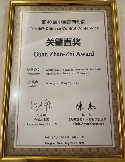 2021年7月28日,我院控制科学与工程系青年教师雷金龙研究员与衣鹏研究员、李莉教授合作的论文“Distributed No-Regret Learning for Stochastic Aggregative Games over Networks”在上海松江举办的第40届中国控制会议(The40th Chinese Control Conference, CCC2021)中荣获第27届“关肇直奖”。