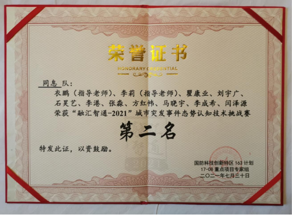 2021年7月30日,在重庆理工大学举办的“融汇智通—2021”城市突发事件态势认识技术挑战赛中,由我院师生组成的“同息队”在所有比赛的三个科目中获得两项第二名、一项第三名,最终获得总成绩第二名的佳绩。