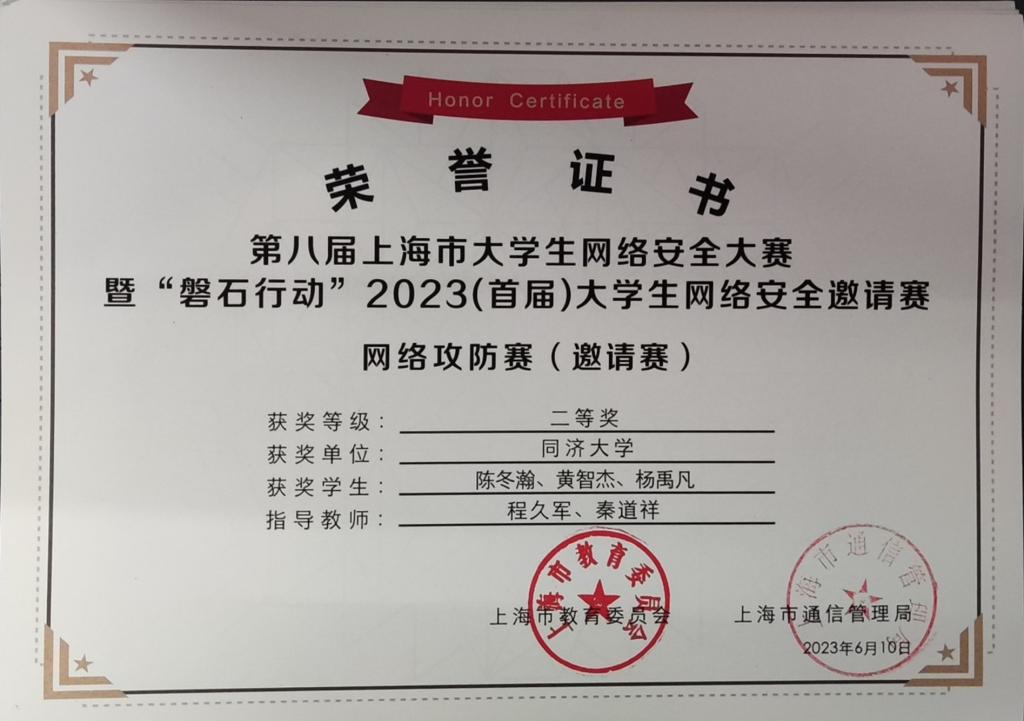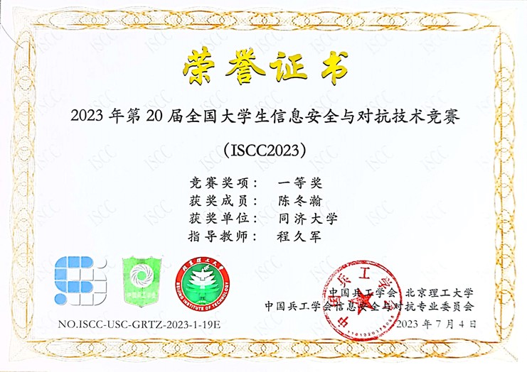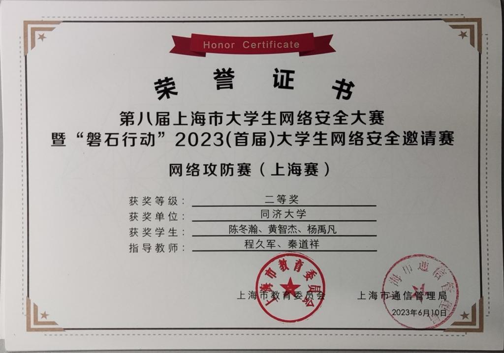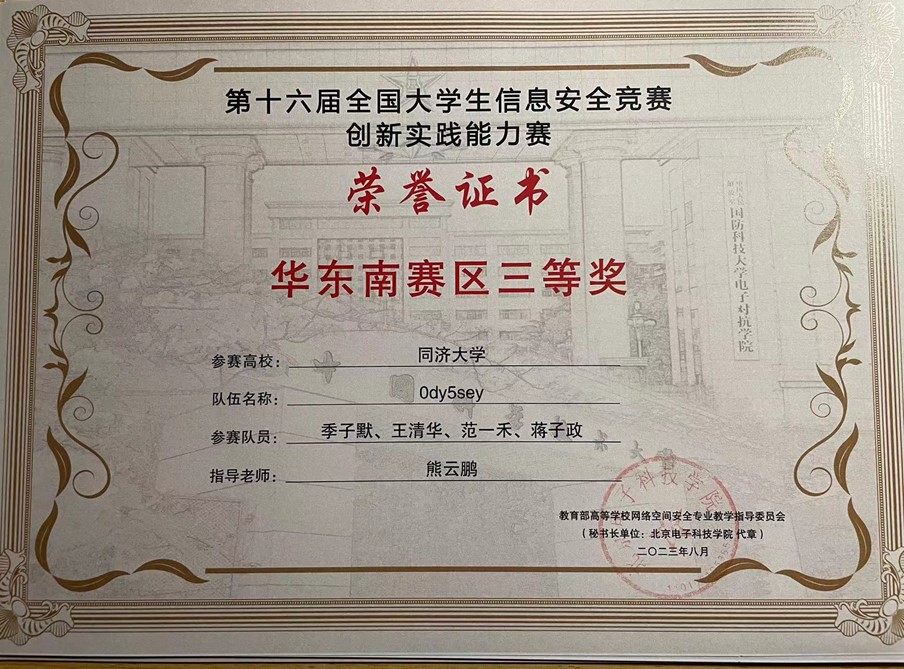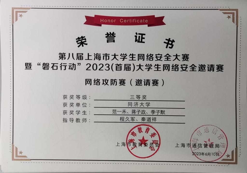 今年,在学院创新基地信息安全实验室的支持下,在学院计算机系程久军教授、校信息办秦道祥及熊云鹏老师的指导下,同济大学网络安全战队CatTrainingForce的成员们分别在各类信息安全比赛中取得了优异成绩:2023第20届全国大学生信息安全与对抗技术竞赛(一等奖:陈冬瀚;三等奖:季子默);第16届全国大学生信息安全竞赛华东南分区网络安全攻防技术赛(二等奖:陈冬瀚、刘孔阳、姜文渊、黄智杰;三等奖:季子默、蒋子政、范一禾、王清华);第八届上海市大学生网络安全大赛暨“磐石行动”2023(首届)大学生网络安全邀请赛网络攻防赛(上海赛)(二等奖:陈冬瀚、杨禹凡、黄智杰;二等奖:季子默、蒋子政、范一禾);第八届上海市大学生网络安全大赛暨“磐石行动”2023(首届)大学生网络安全邀请赛网络攻防赛(邀请赛)(二等奖:陈冬瀚、杨禹凡、黄智杰;三等奖:季子默、蒋子政、范一禾)。( 文/陈冬瀚 图/季子默 )
