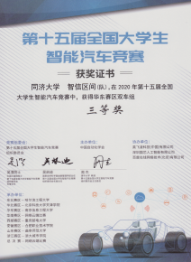 2020年8月24日-8月26日,由中国自动化学会主办,第十五届全国大学生智能汽车竞赛创意组总决赛、华东赛区预决赛在南京信息工程大学举办。本届大赛创意组总决赛经过预赛环节后,遴选来自全国70所高校的90支队伍、共计340余人参赛;华东赛区预决赛有来自上海、江苏、江西的59所高校209支队伍、共计560余人参赛。同济大学参赛队伍由我院教师张志明和朱劲带队,张施皛和和李伟博同学随队辅助,再获佳绩。其中我院队伍获得创意组总决赛全国一等奖1项、三等奖1项;此外我院队伍还获得华东赛区二等奖1项、三等奖2项,汽车学院队伍获得华东赛区三等奖1项。