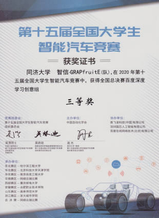 本届创意组比赛设ROS室外光电组和深度学习组两个组别,总决赛难度加大,场景化地复现人工智能在实际领域中的应用。电信学院大学生智能车竞赛实验室组建的两支队伍先后在各自组别的预赛中杀出重围,成功晋级,代表同济大学参加线下现场总决赛。其中“智信ROS”队在ROS光电组国赛预决赛中以18.69秒成绩排名第9,在一等奖排位赛中因车模齿轮机械故障遗憾未能发车,最终排名11(全国一等奖),队员:赵师兵(自动化)、郭展羽(自动化)、贺兰山(自动化)、郑家齐(通信工程),指导教师:张志明、余有灵;“智信•GRAPfruitE”队在深度学习组总决赛比赛中取得全国三等奖,参赛队员:陈麒宇(通信工程)、党荣浩(自动化)、张天成(通信工程);指导教师:张志明、朱劲。